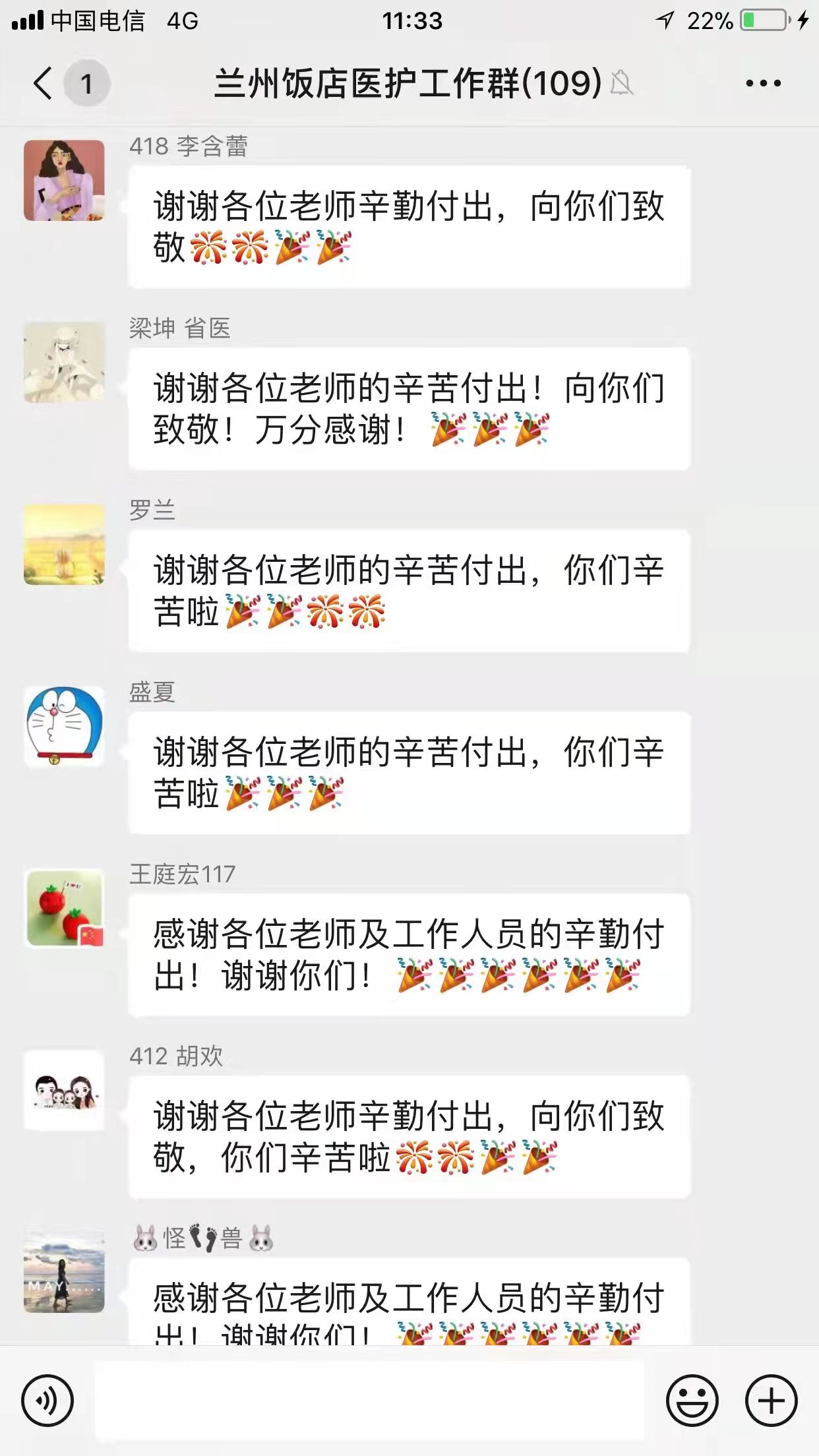 抗擊新冠肺炎疫情,事關(guān)大局,關(guān)乎每個人的生命安全與身體健康。疫情發(fā)生后,飯店領(lǐng)導(dǎo)和所有黨員干部主動擔(dān)當(dāng)、敢于作為,堅持工作在一線,體現(xiàn)了飯店的社會責(zé)任,為疫情防控積極奉獻(xiàn)力量。隔離結(jié)束后,醫(yī)護人員們通過感謝信、微信和電話等方式,由衷感謝蘭州飯店服務(wù)人員的暖心陪伴和貼心服務(wù)。